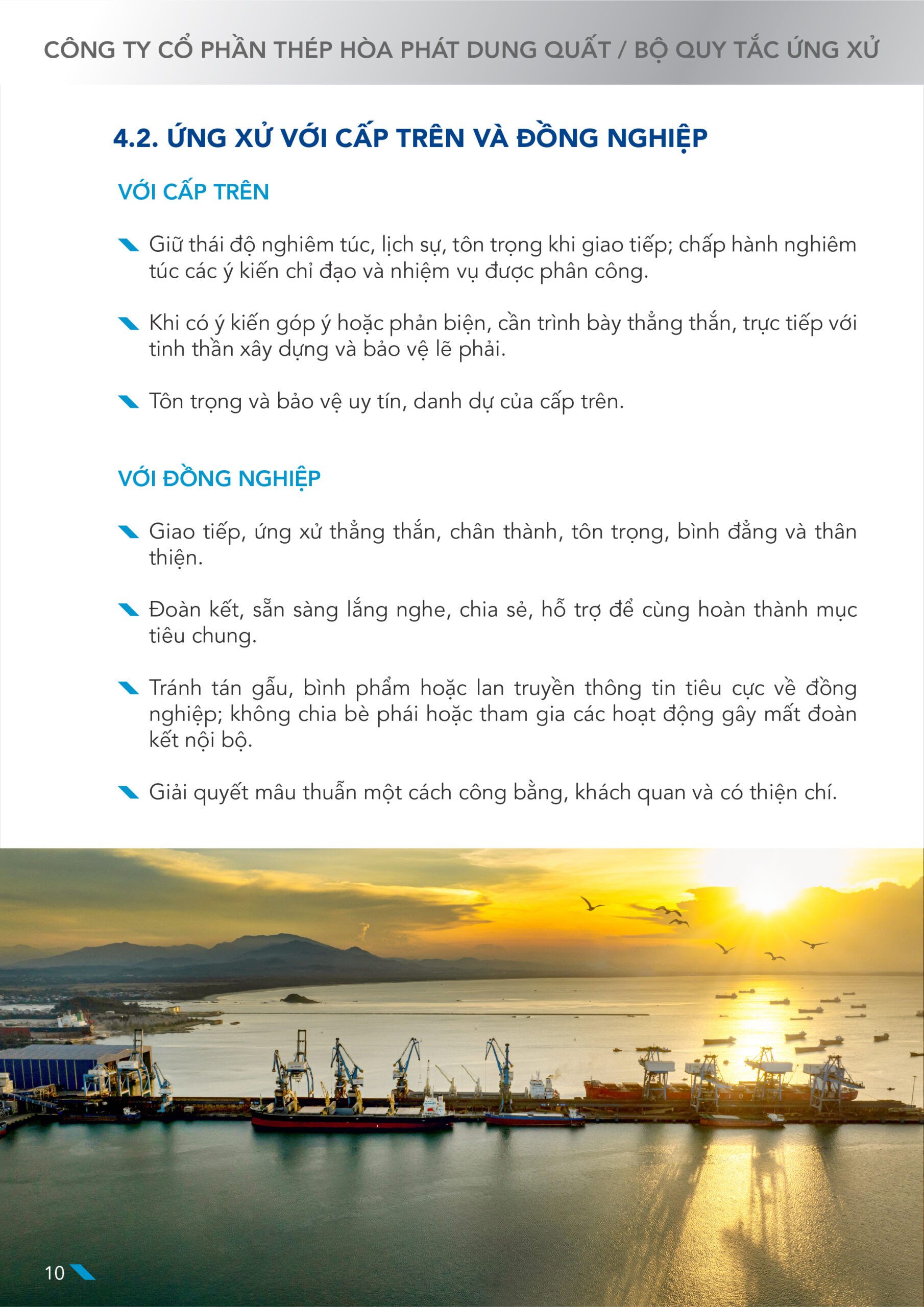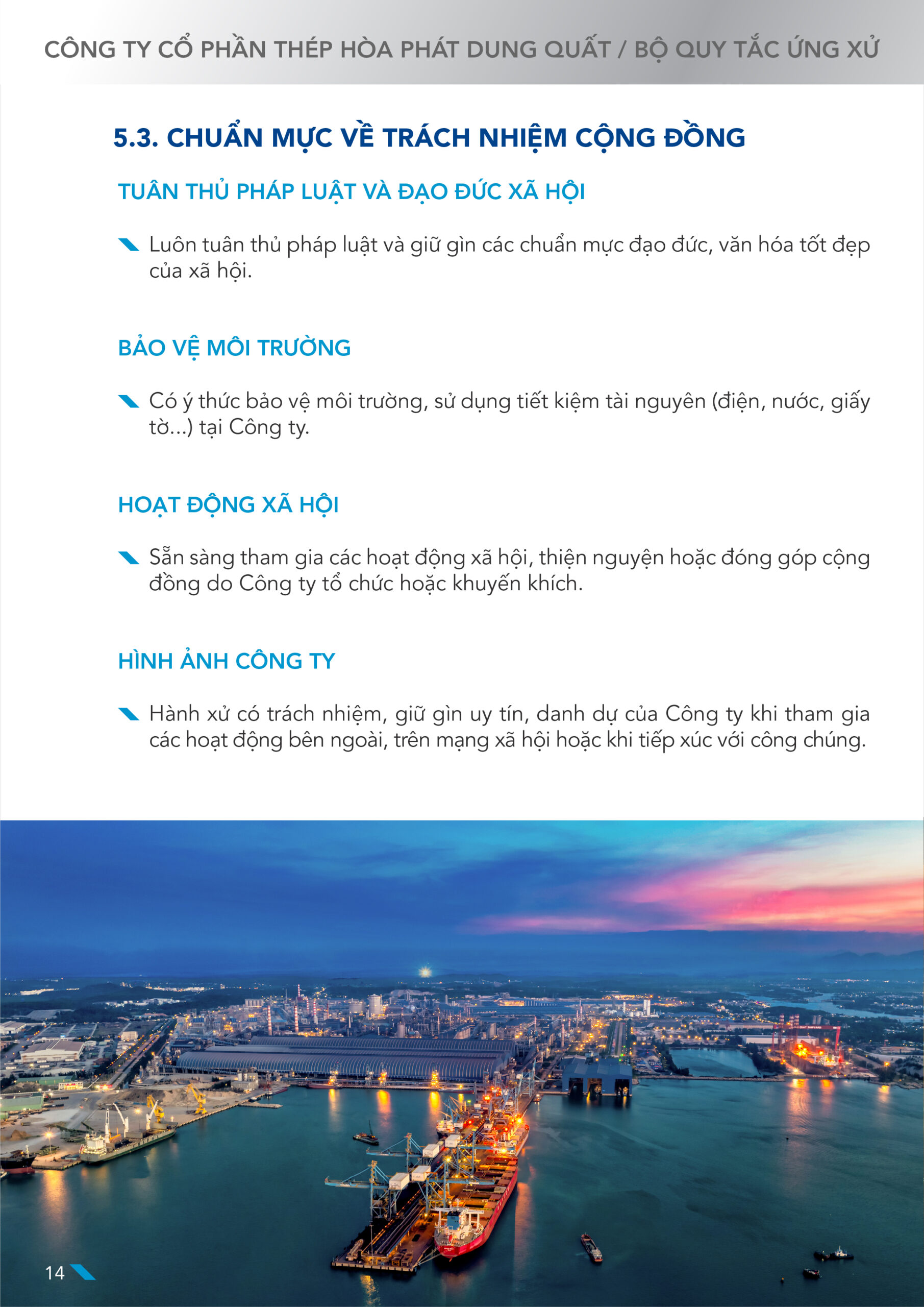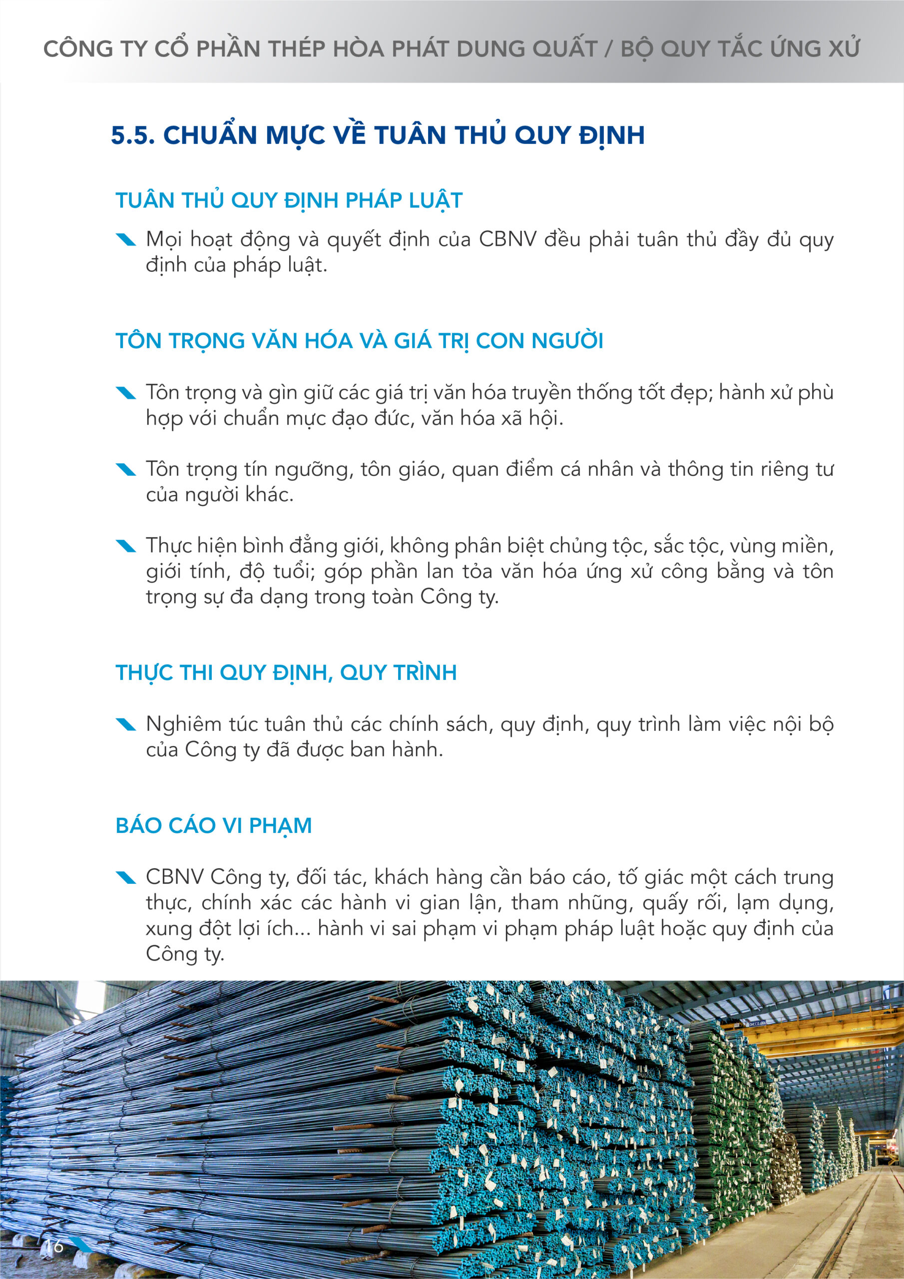 Ngày 01/10/2025, Công ty Cổ phần Thép Hòa Phát Dung Quất chính thức ban hành Bộ Quy tắc ứng xử áp dụng cho toàn thể CBNV Công ty, đánh dấu bước tiến quan trọng, khẳng định cam kết của Công ty trong hành trình xây dựng văn hóa doanh nghiệp thống nhất, chuyên nghiệp và nhân văn.