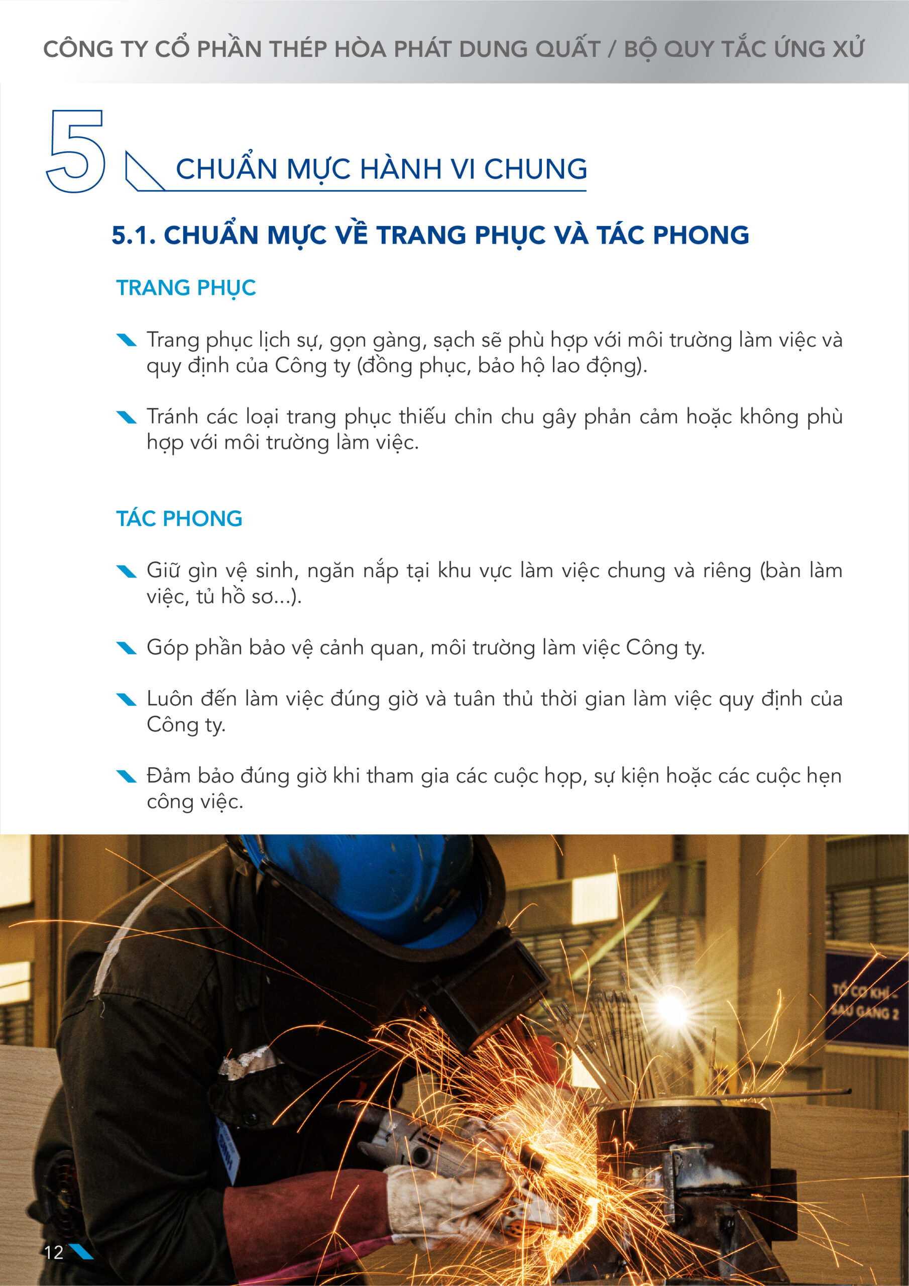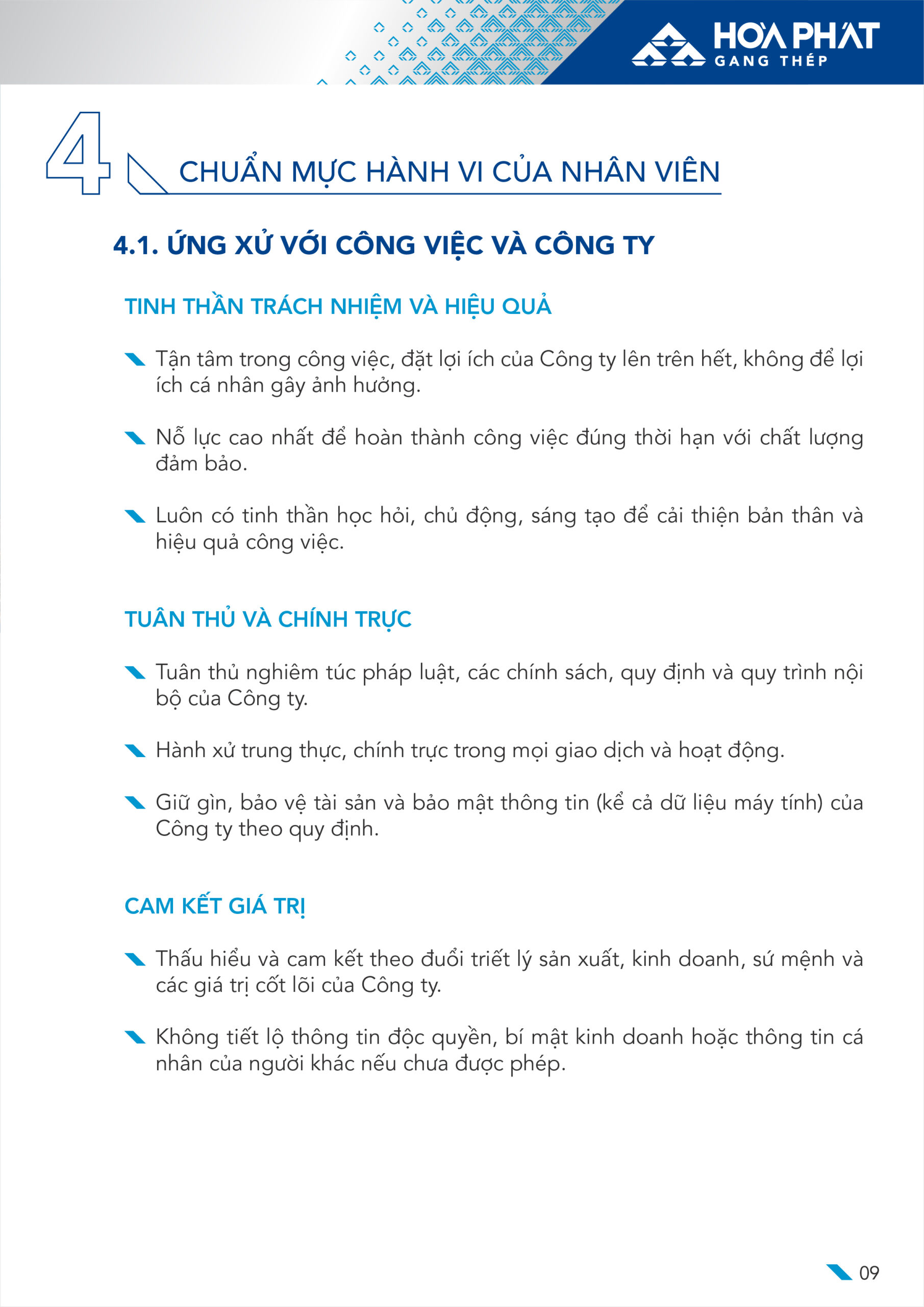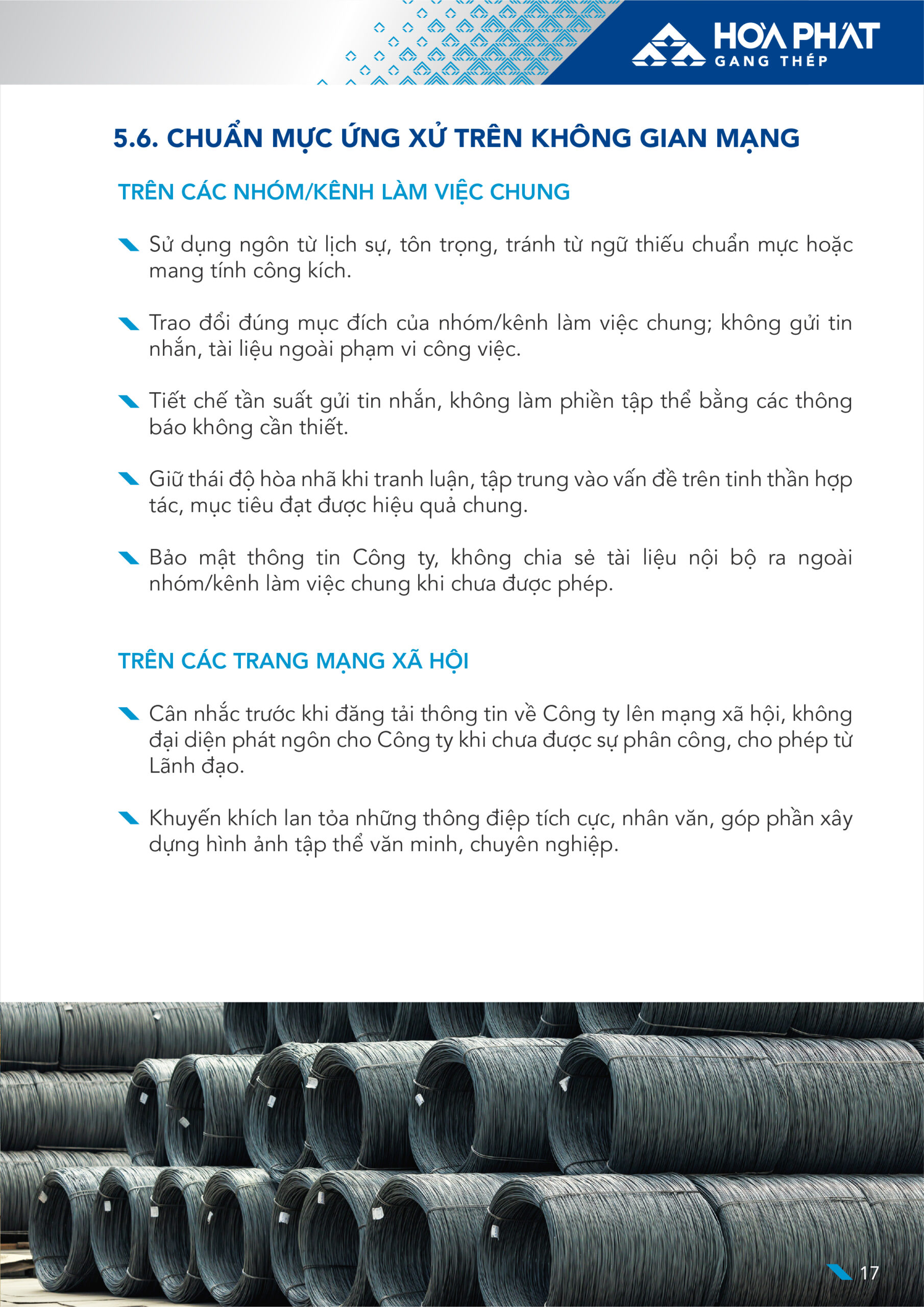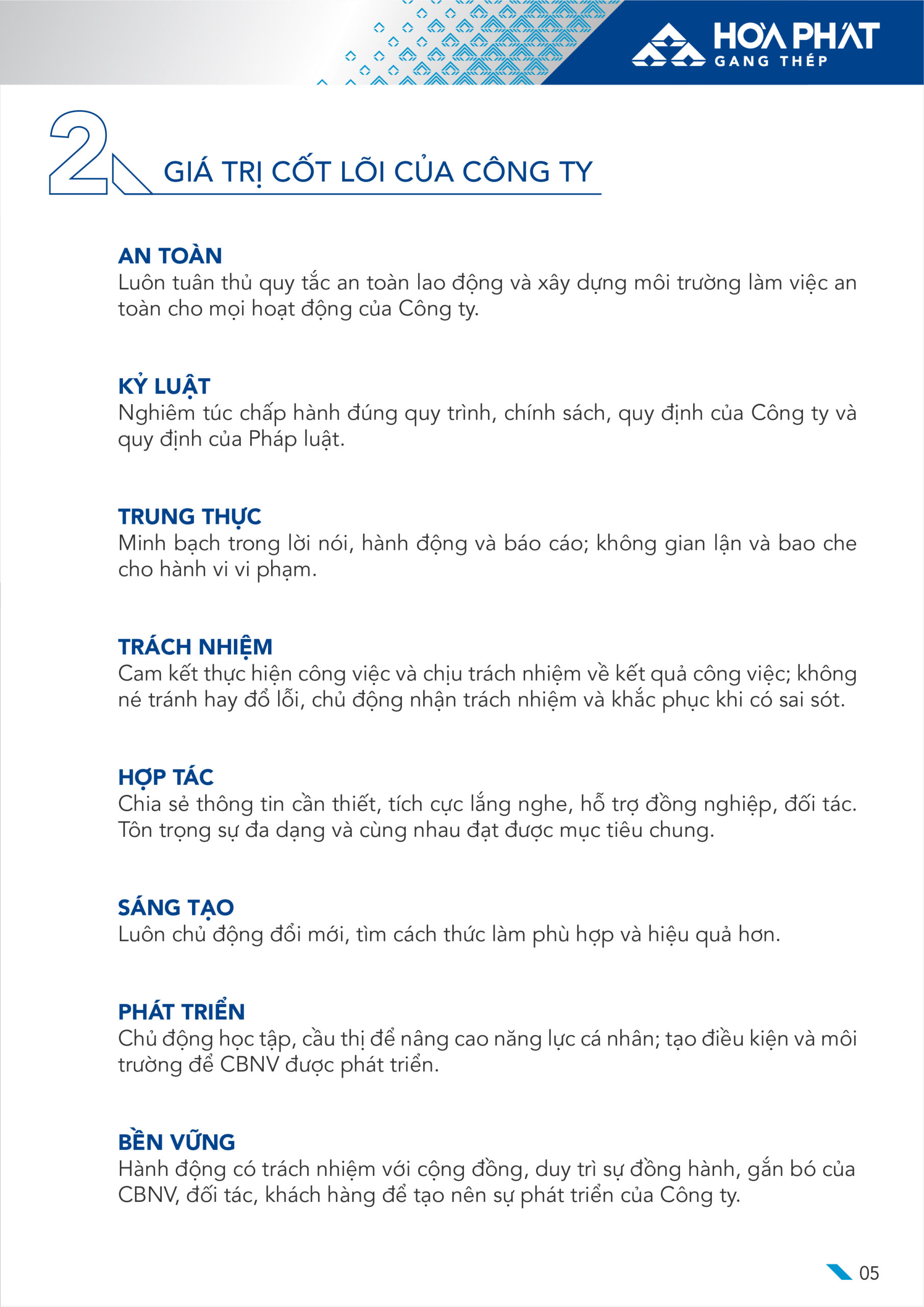 Bộ Quy tắc ứng xử là kim chỉ nam định hướng tư duy, hành động và phong cách ứng xử của mỗi cán bộ nhân viên trong mọi tình huống, từ công việc nội bộ, quan hệ đồng nghiệp đến giao tiếp với khách hàng, đối tác và cộng đồng. Dựa trên tám giá trị cốt lõi của Công ty: An toàn – Kỷ luật – Trung thực – Trách nhiệm – Hợp tác – Sáng tạo – Phát triển – Bền vững, tài liệu này thể hiện rõ bản sắc và tinh thần của người Nhà Thép.