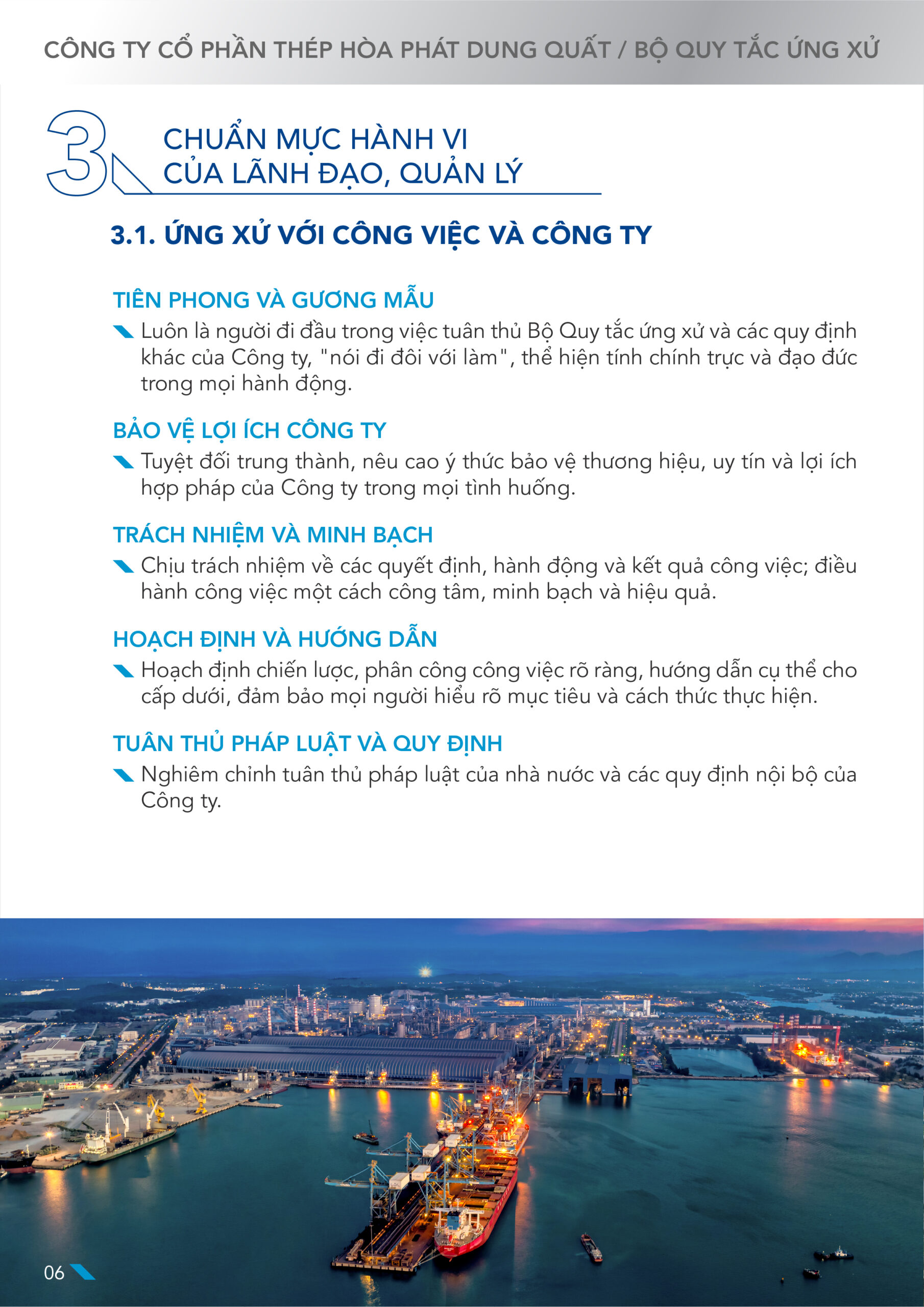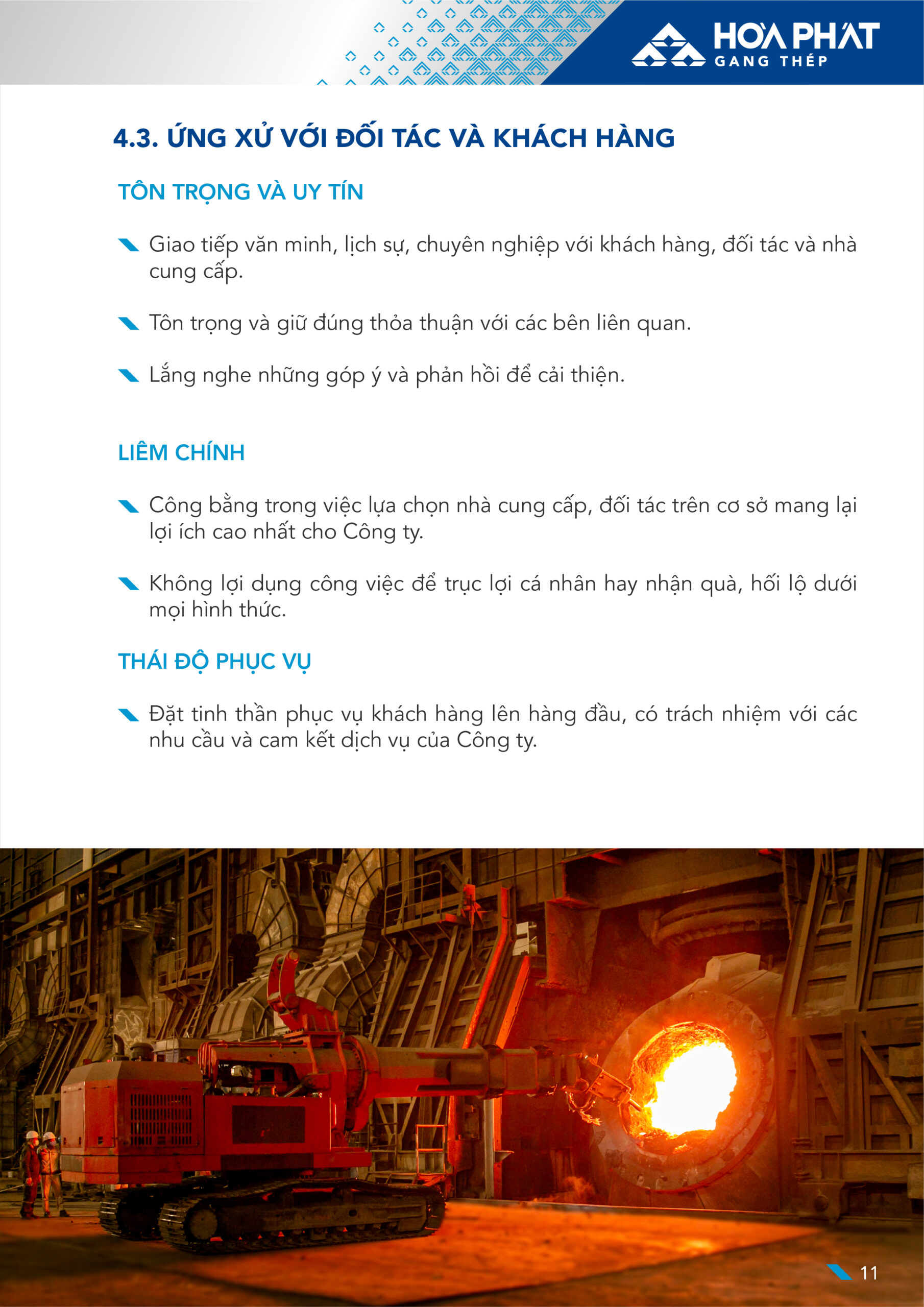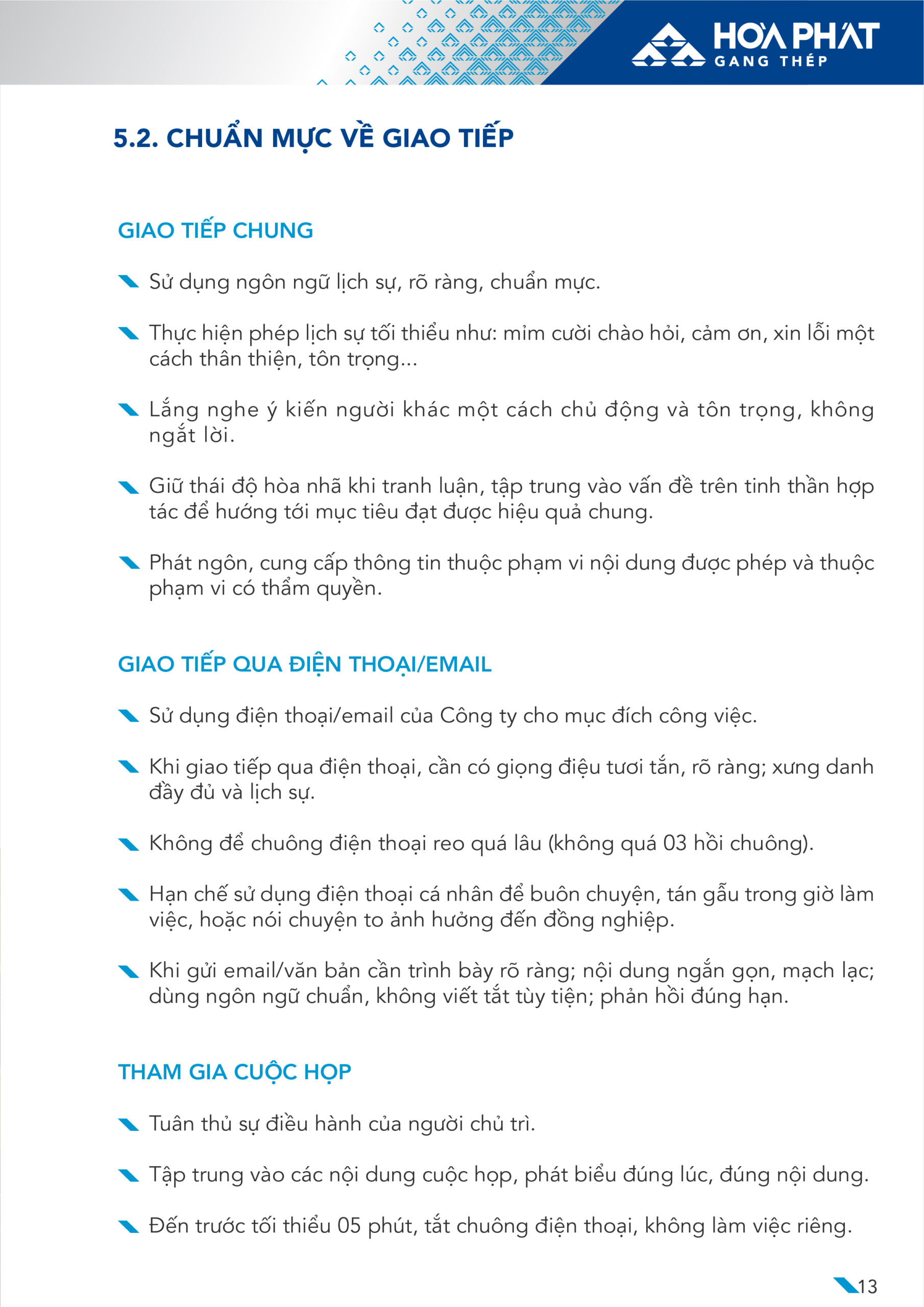 Bộ Quy tắc ứng xử là kim chỉ nam định hướng tư duy, hành động và phong cách ứng xử của mỗi cán bộ nhân viên trong mọi tình huống, từ công việc nội bộ, quan hệ đồng nghiệp đến giao tiếp với khách hàng, đối tác và cộng đồng. Dựa trên tám giá trị cốt lõi của Công ty: An toàn – Kỷ luật – Trung thực – Trách nhiệm – Hợp tác – Sáng tạo – Phát triển – Bền vững, tài liệu này thể hiện rõ bản sắc và tinh thần của người Nhà Thép.