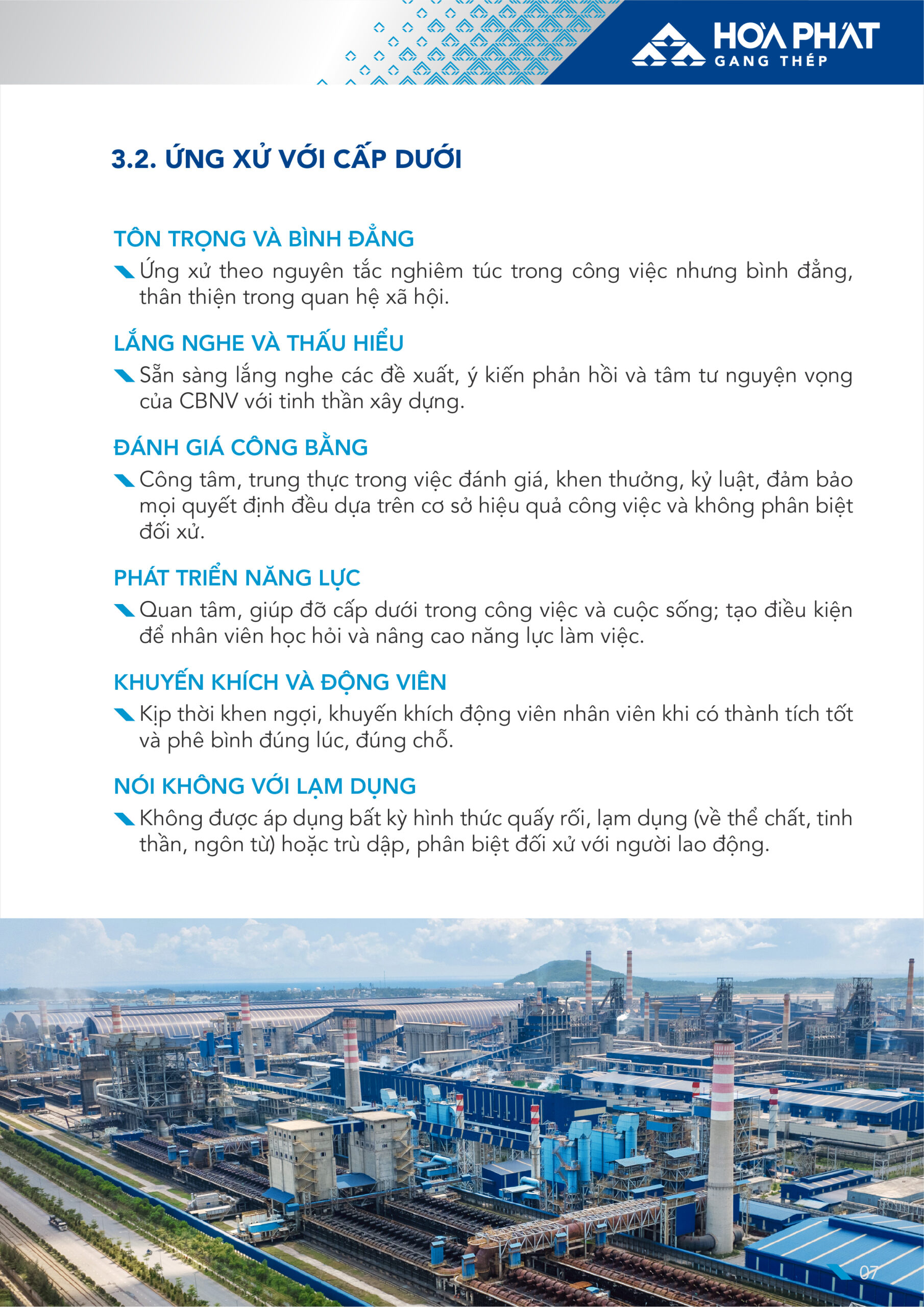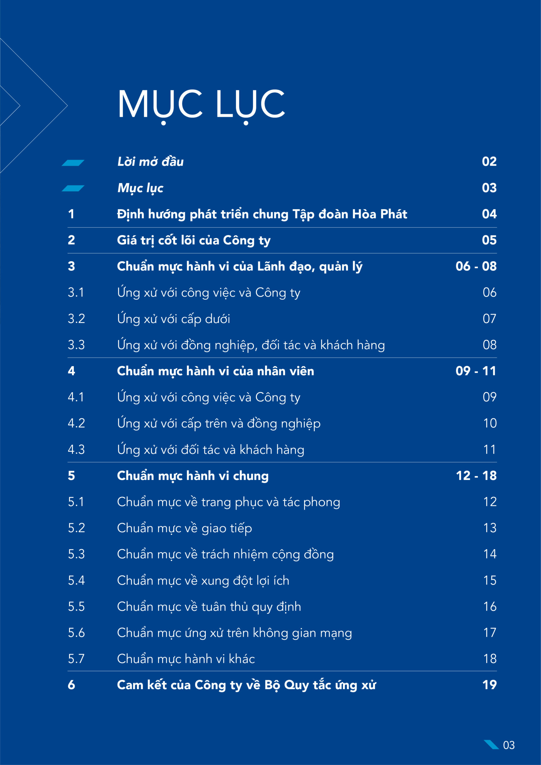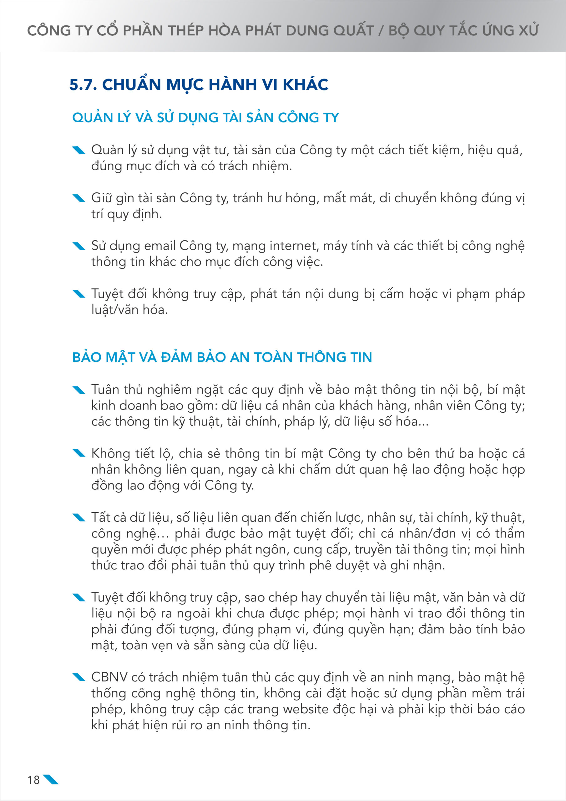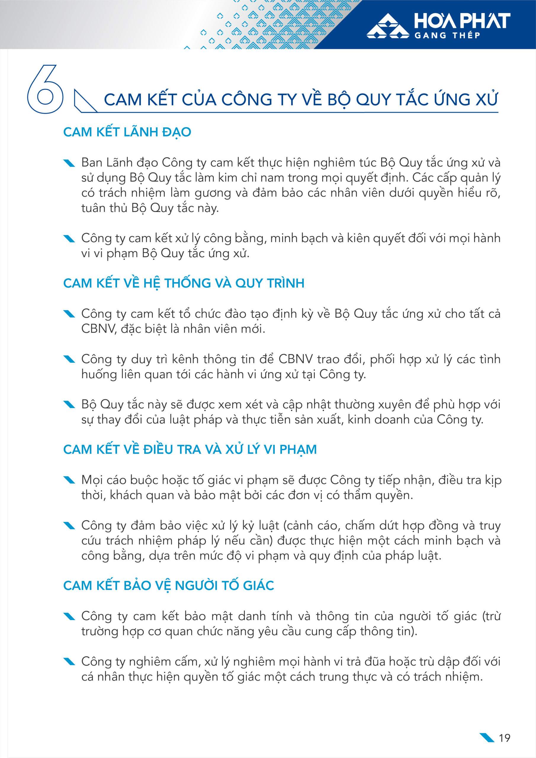 Bộ Quy tắc ứng xử là kim chỉ nam định hướng tư duy, hành động và phong cách ứng xử của mỗi cán bộ nhân viên trong mọi tình huống, từ công việc nội bộ, quan hệ đồng nghiệp đến giao tiếp với khách hàng, đối tác và cộng đồng. Dựa trên tám giá trị cốt lõi của Công ty: An toàn – Kỷ luật – Trung thực – Trách nhiệm – Hợp tác – Sáng tạo – Phát triển – Bền vững, tài liệu này thể hiện rõ bản sắc và tinh thần của người Nhà Thép.