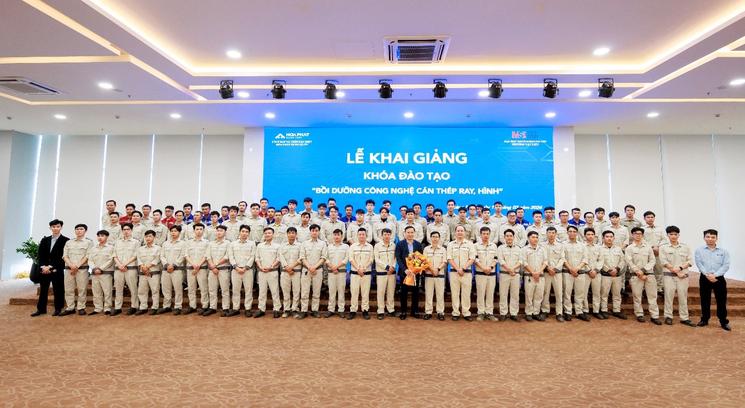 Sáng ngày 13/03/2026, Công ty Cổ phần Ray và Thép đặc biệt Hòa Phát Dung Quất phối hợp cùng Trường Vật liệu – Đại học Bách khoa Hà Nội tổ chức Lễ khai giảng khóa đào tạo “Bồi dưỡng Công nghệ Cán thép Ray, Hình” cho 75 CBNV. Trước đó, Công ty cũng đã tổ chức thành công một khóa đào tạo về Công nghệ Cán thép Ray, Hình với sự tham gia của đông đảo đội ngũ cán bộ kỹ thuật, qua đó nhận được nhiều phản hồi tích cực và góp phần nâng cao năng lực chuyên môn cho đội ngũ nhân sự trực tiếp tham gia sản xuất.